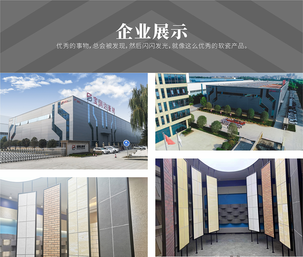 寶潤達(dá)外墻軟瓷磚:具有安全環(huán)保、抗震防裂、耐火防凍、拒水透氣、耐酸耐堿等優(yōu)良特性,表現(xiàn)力豐富,是良好的室內(nèi)外建筑飾面材料