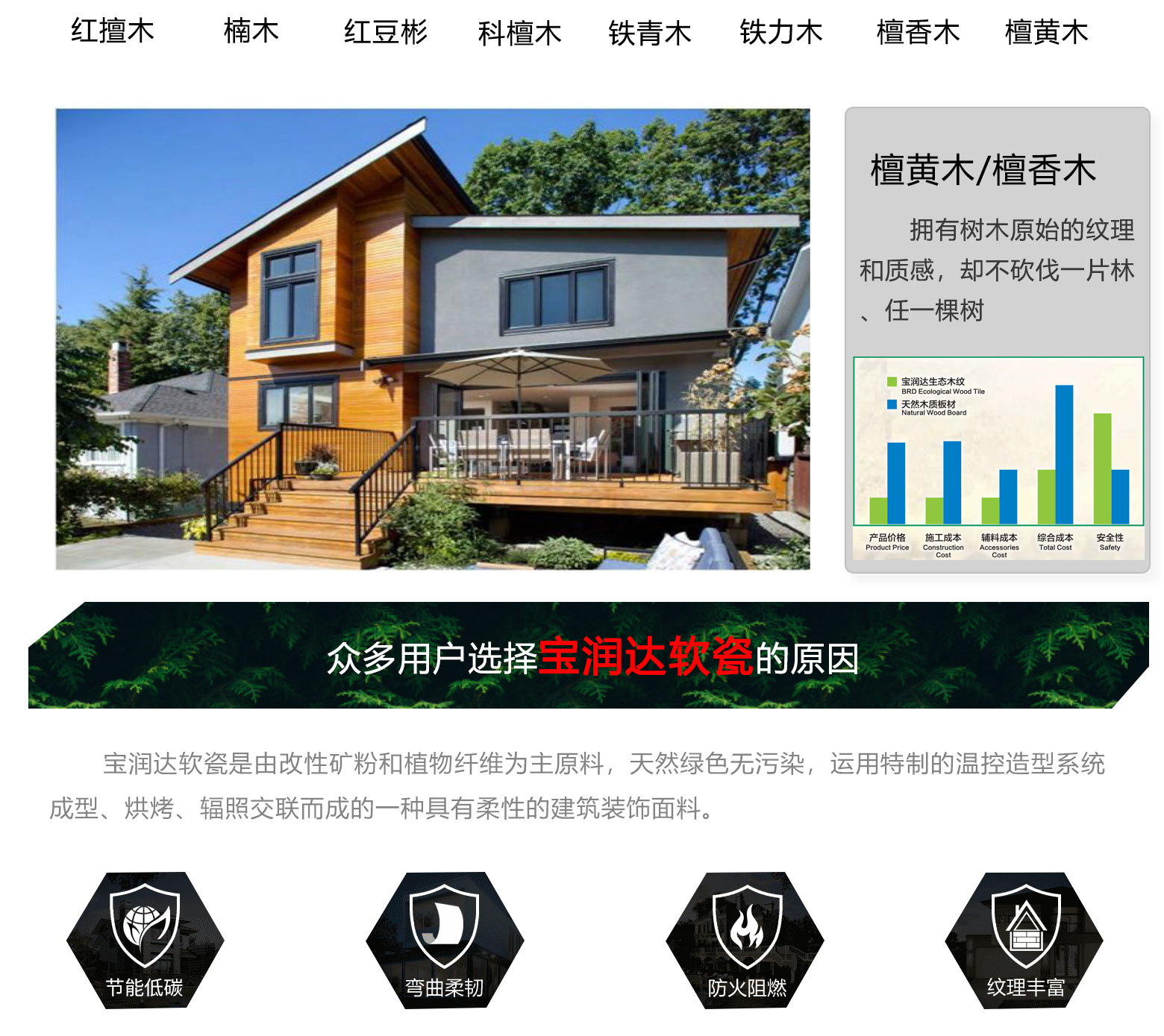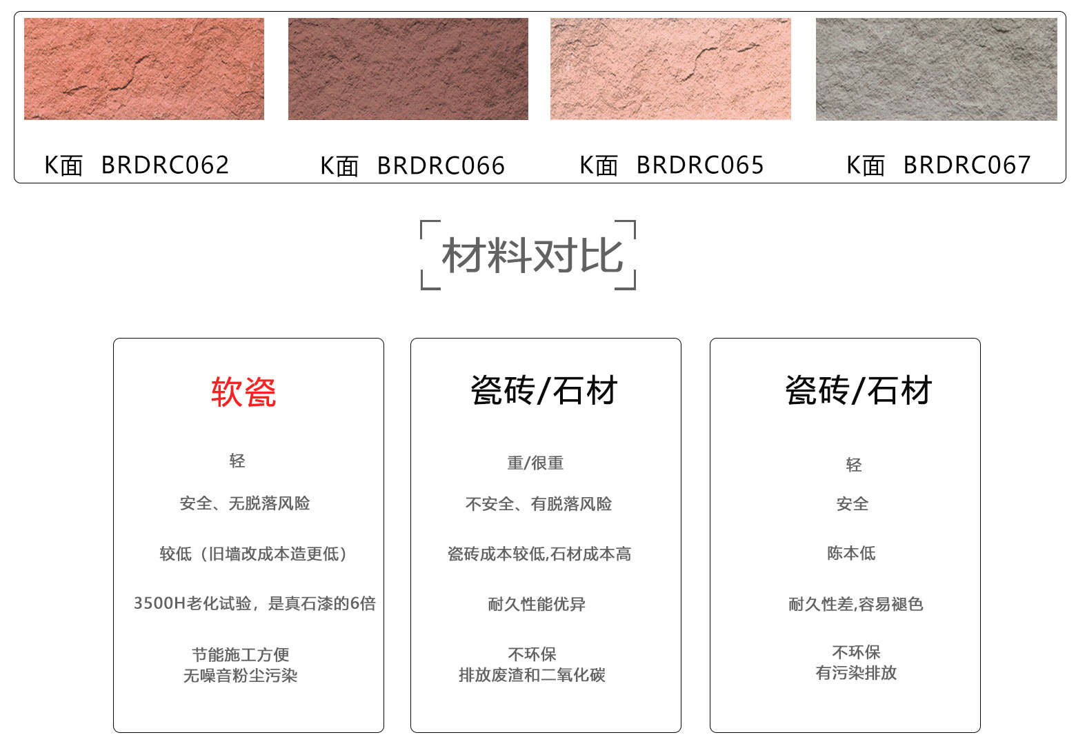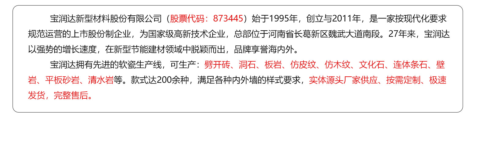 寶潤達外墻軟瓷磚:具有安全環保、抗震防裂、耐火防凍、拒水透氣、耐酸耐堿等優良特性,表現力豐富,是良好的室內外建筑飾面材料