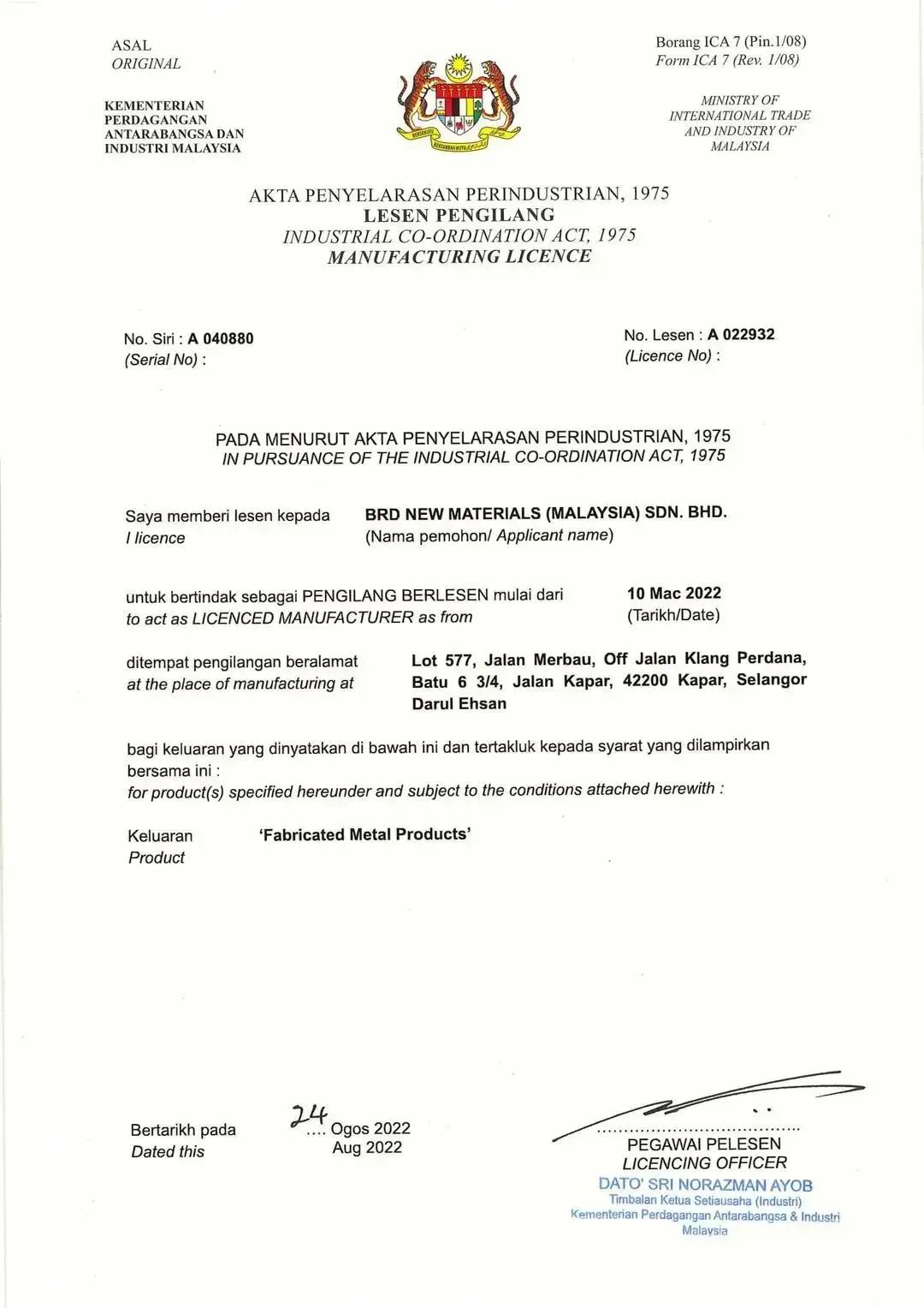 寶潤達新材馬來西亞公司已獲鋼結構生產執照。