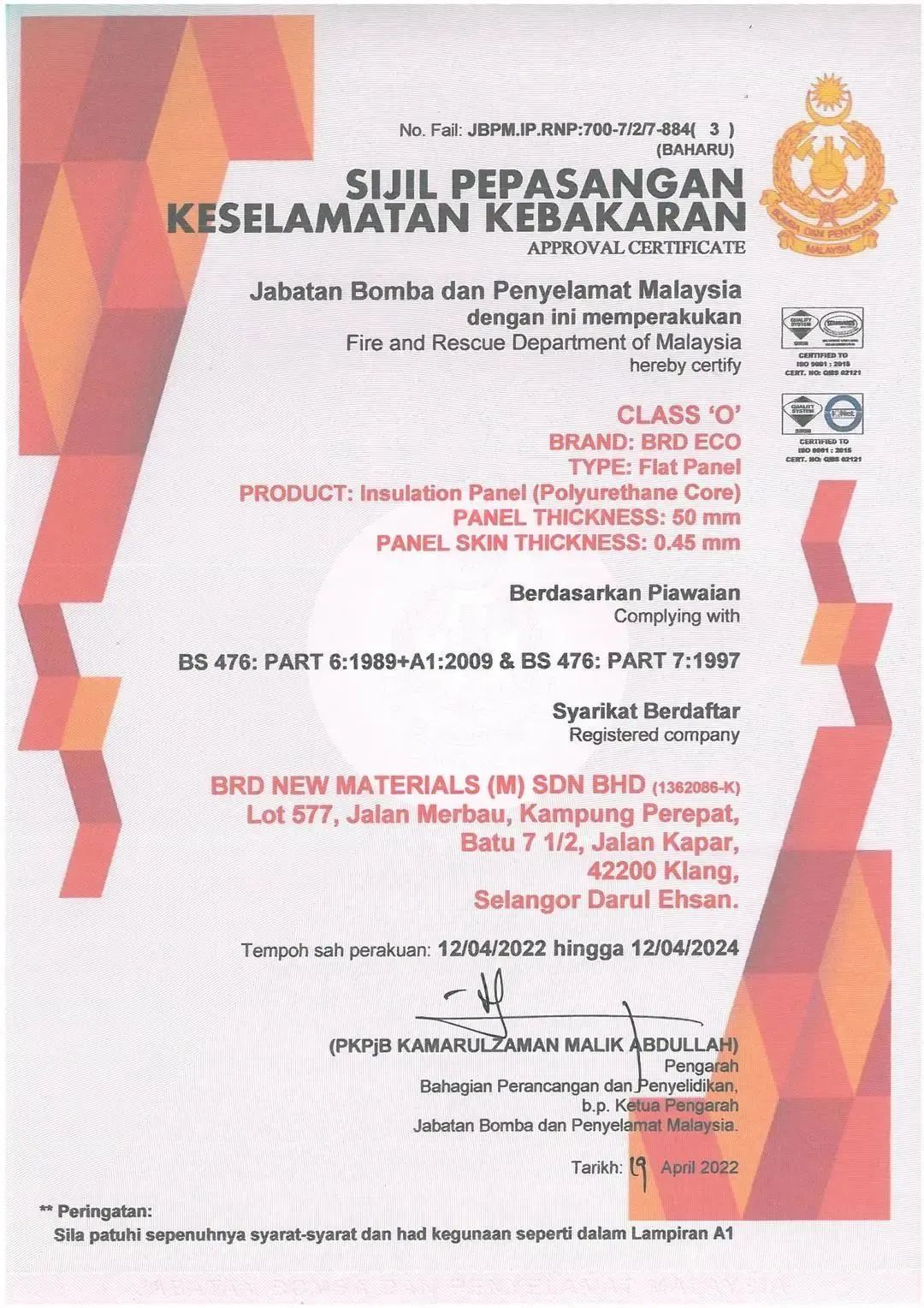 寶潤達新材馬來西亞公司已獲聚氨酯復合板防火證書并通過馬來西亞聚氨酯復合板SIRIM防火檢測。