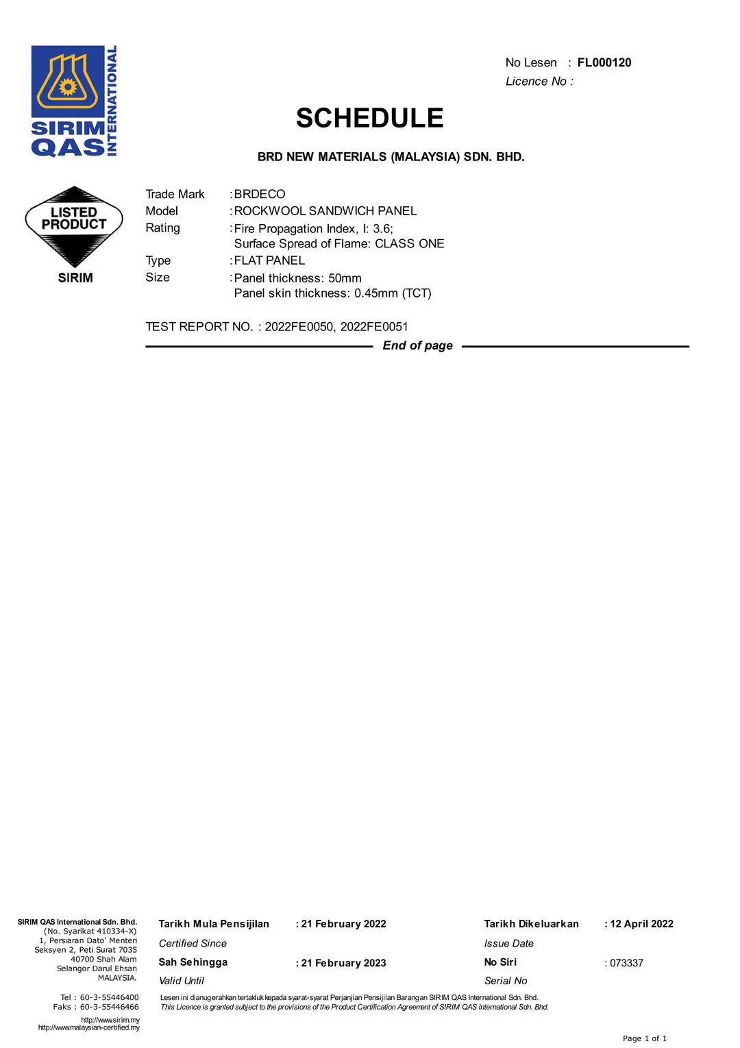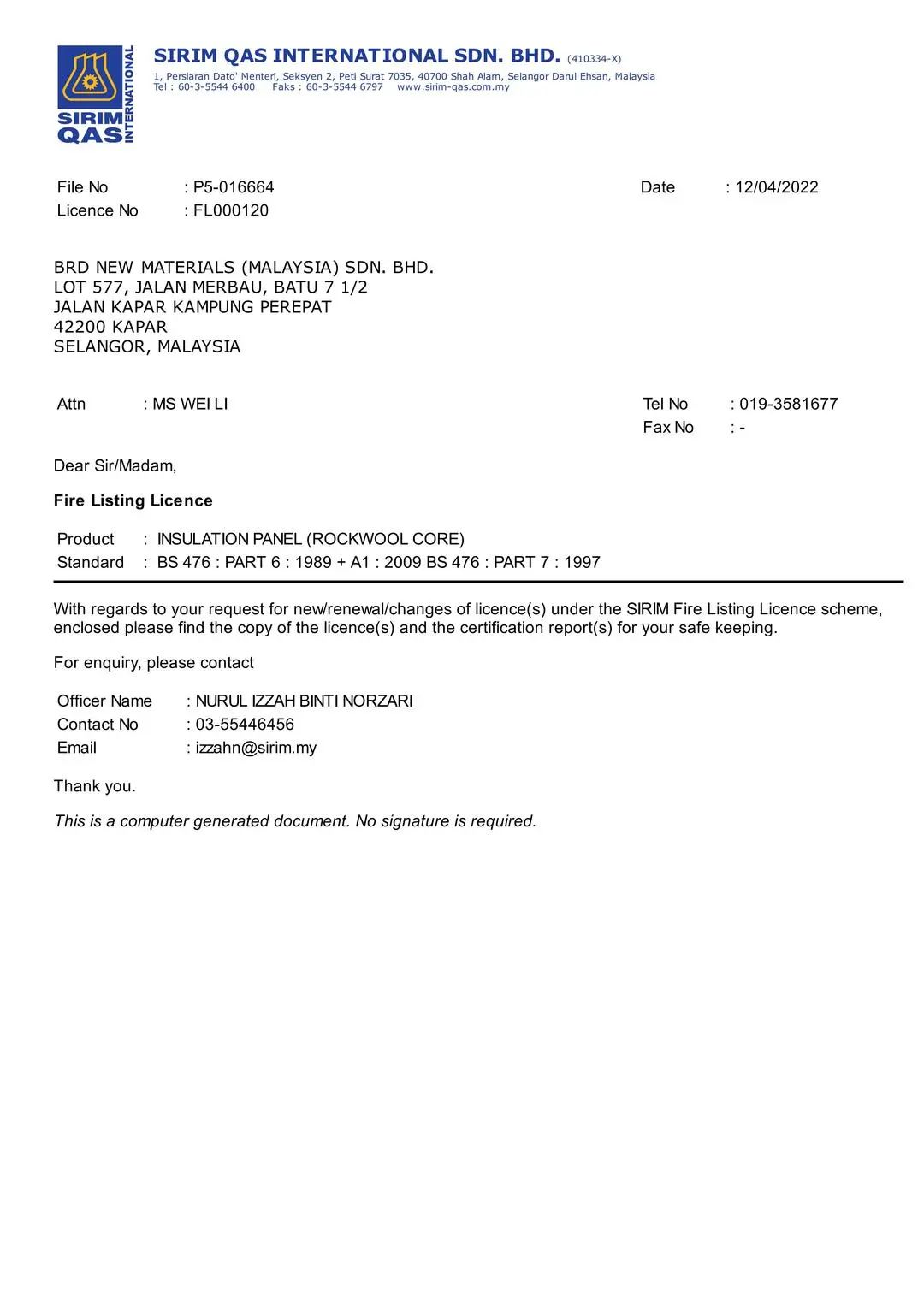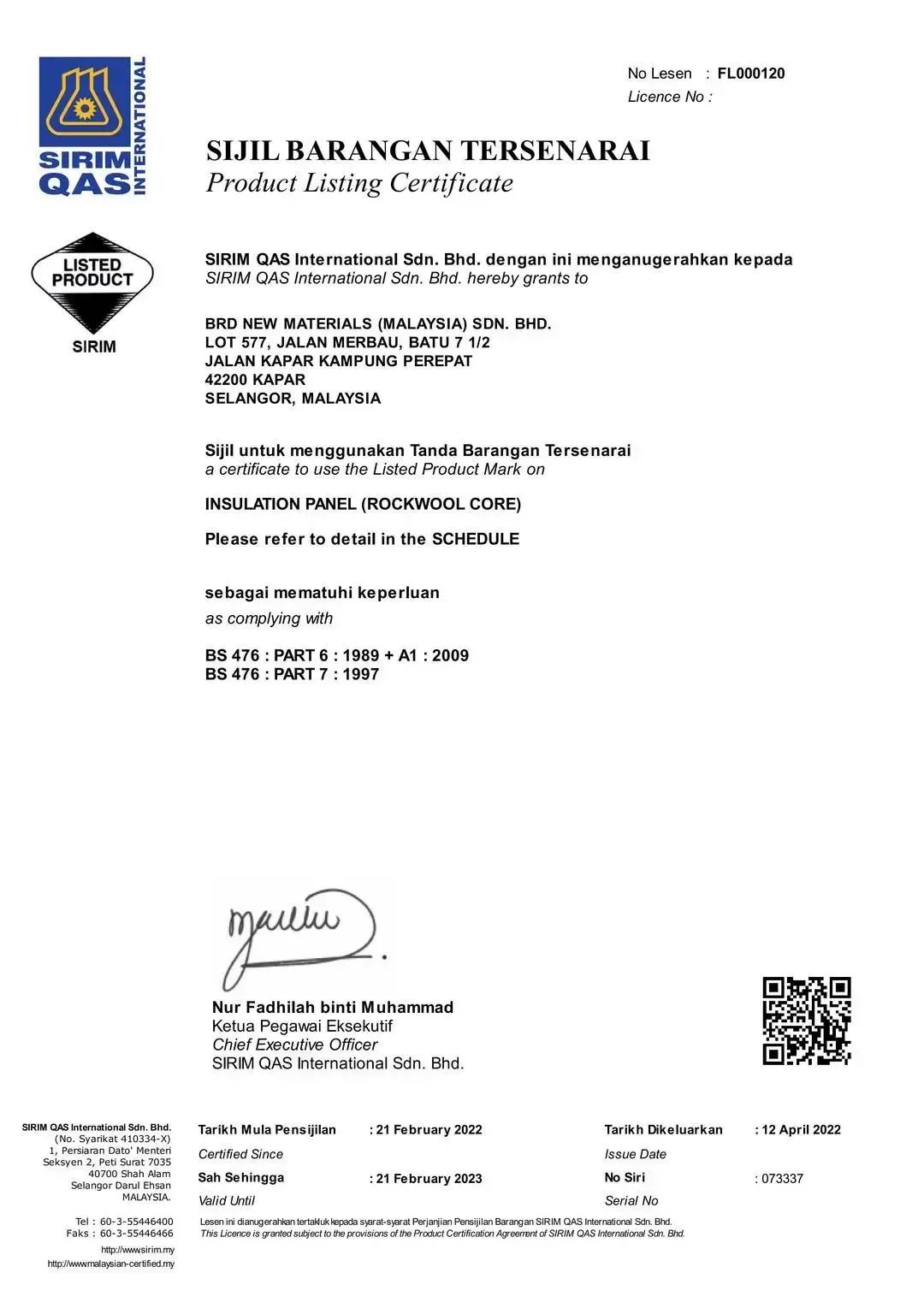 寶潤達新材馬來西亞公司已獲巖棉復合板防火證書并通過馬來西亞巖棉復合板SIRIM防火檢測。